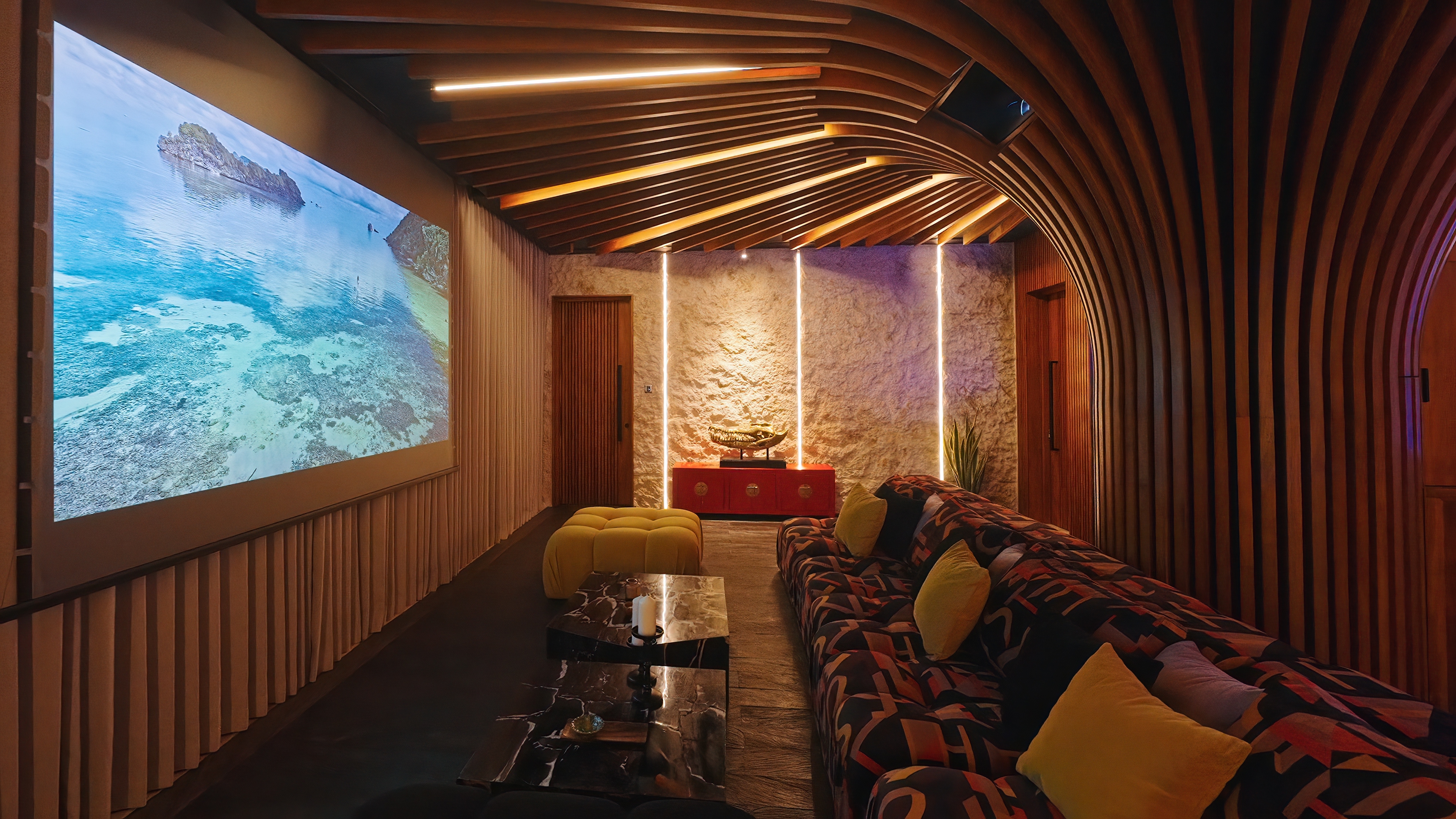 This versatile space is designed for fun - with a home cinema setup, private bar, and saltwater aquarium as the backdrop. Whether it’s a movie night, karaoke session, or DJ party, the lounge adapts to match the mood.