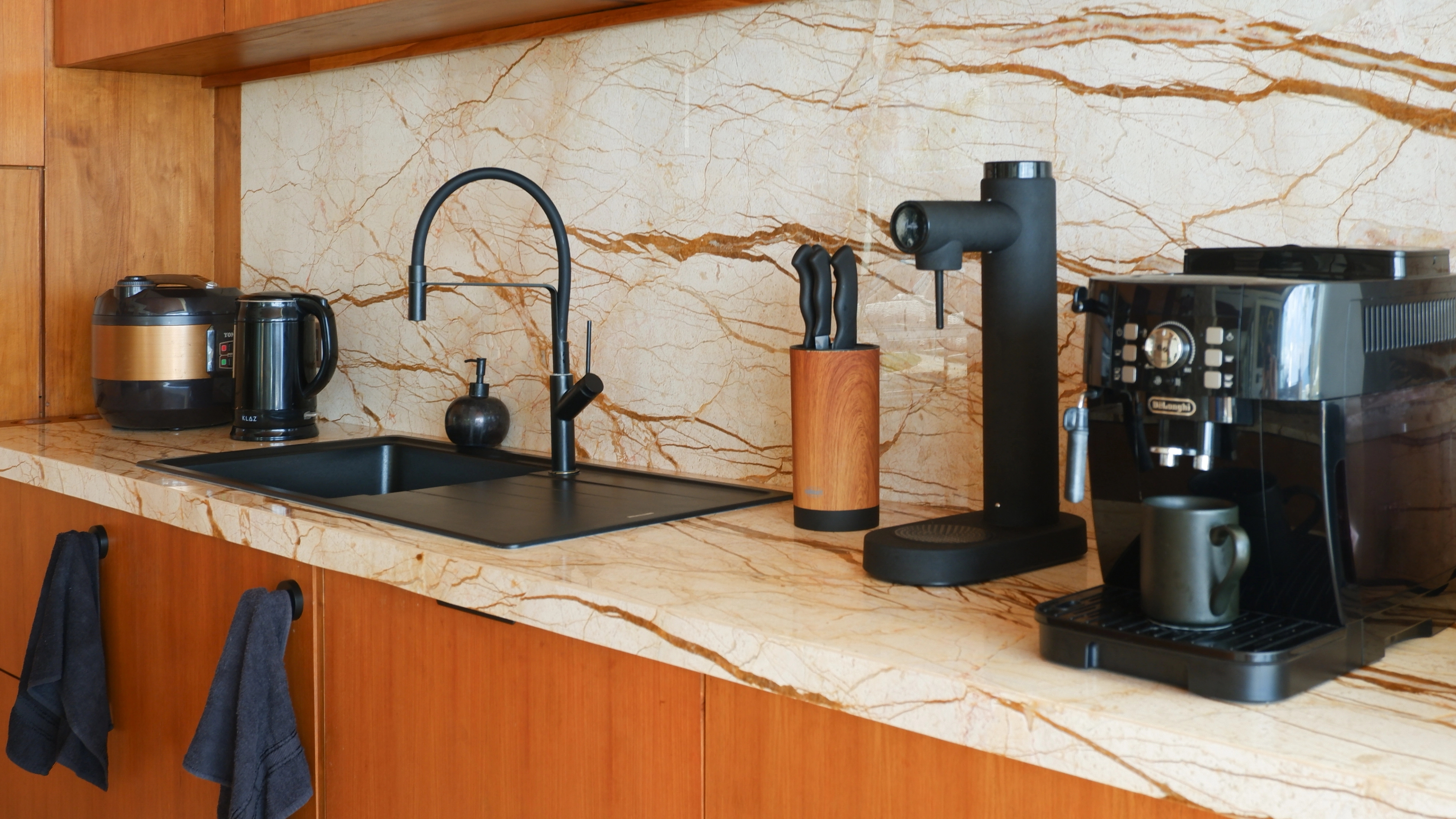 The open-plan kitchen is fully equipped with premium appliances and everything you need to cook, snack, or entertain in style. A large wine chiller, double-door fridge, coffee machine, induction stove and more, make it as practical as it is elegant.